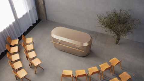 Eine Abschiednahme ist sowohl in unseren Räumlichkeiten vor Ort, als auch bei der Einbettung in den Kokon im Alvarium, dem Gebäude in dem die Warben stehen, möglich. Dabei können An-und Zugehörige das Ritual der Bedeckung selbstständig vornehmen und den Abschied auch durch persönliche und vergängliche „Sargbeigaben“ mitgestalten.